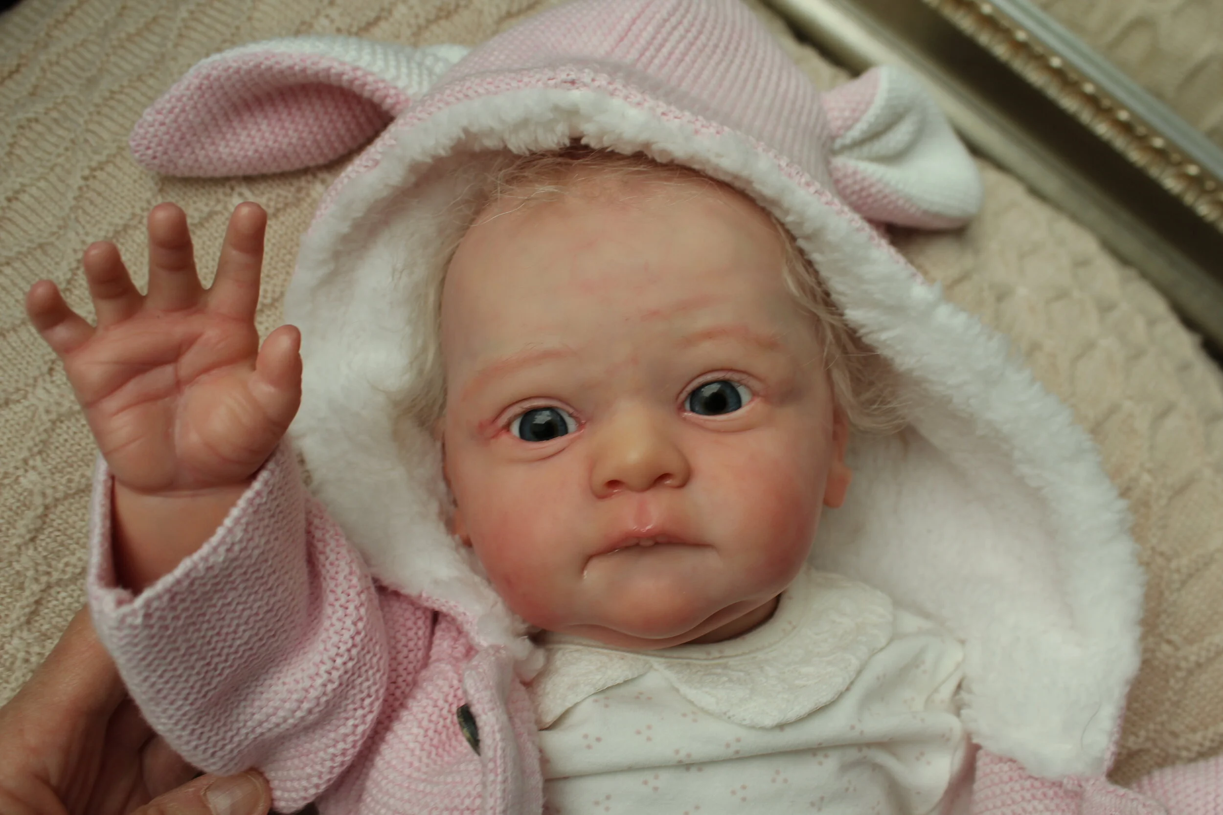 This beautiful baby girl is created with many layers of Real Effect Colors. She is just so sweet. Always a happy face! I love this little baby girl. She has hand applied eyelashes and eyebrows. Her hair is microrooted with light high quality mohair. It looks really natural and fits this chubby baby.